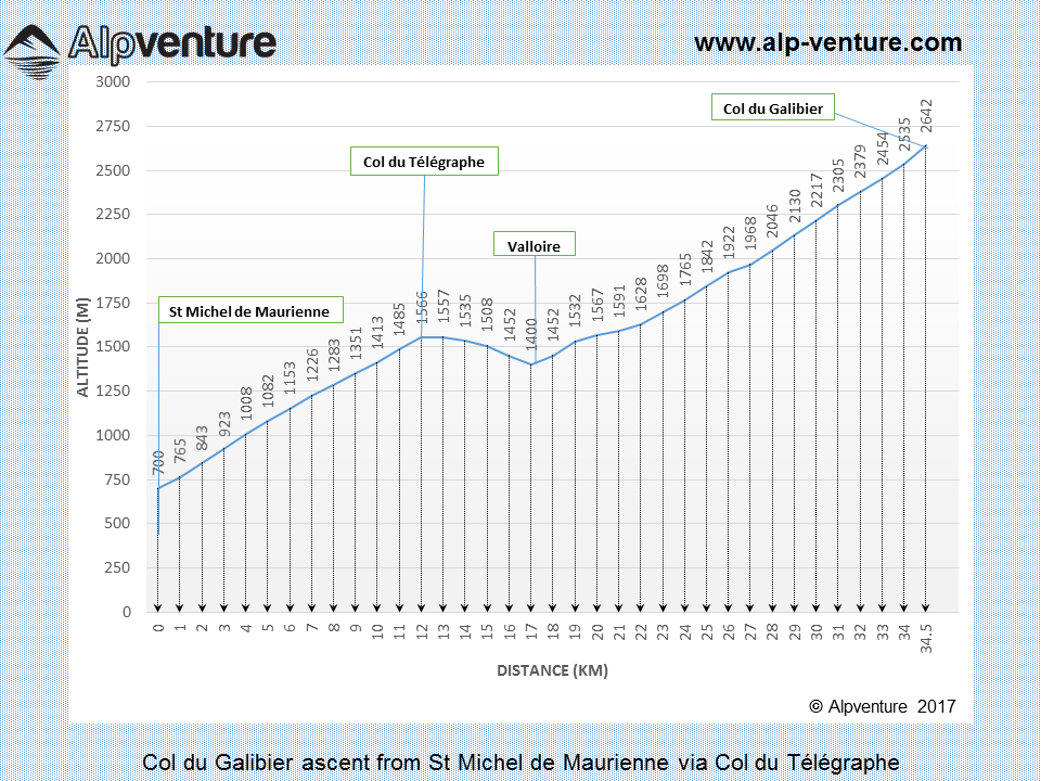 - After descending to Valloire the climb starts with quite a gentle gradient for the first 5km then increases slightly for the rest of the climb with gradients ranging from 7% to 10%. There are a few water sources along the main road with the last one being located at a refuge 8km below the Col.